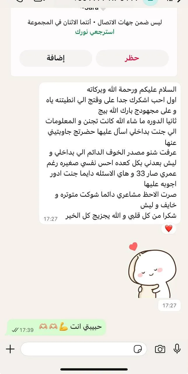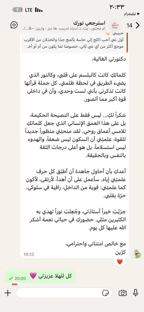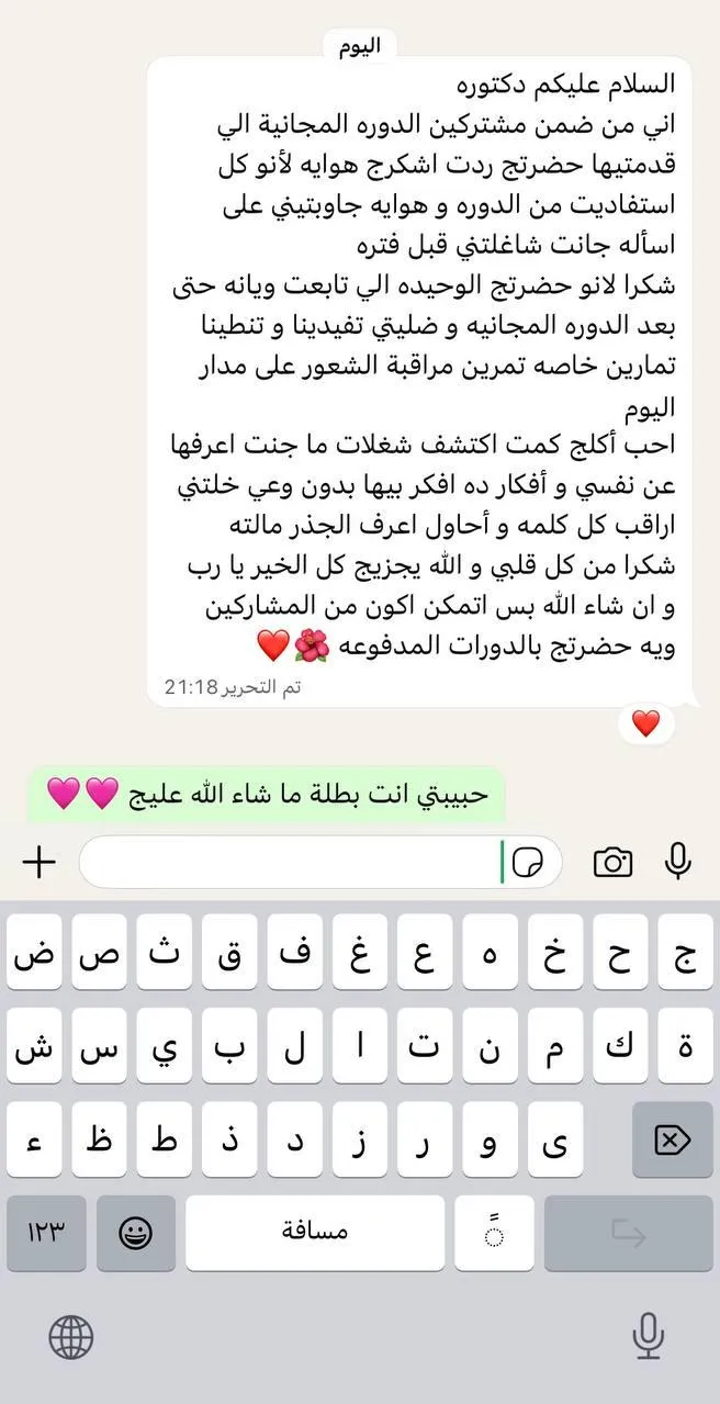 3. رسم خارطة طريق للتشافي: بنهاية المكالمة، ستكون لديك رؤية واضحة عن الخطوات العملية (مثل إعادة برمجة العقل اللاواعي) التي تحتاجينها لكسر هذه القيود واستعادة ثقتك واستحقاقك.